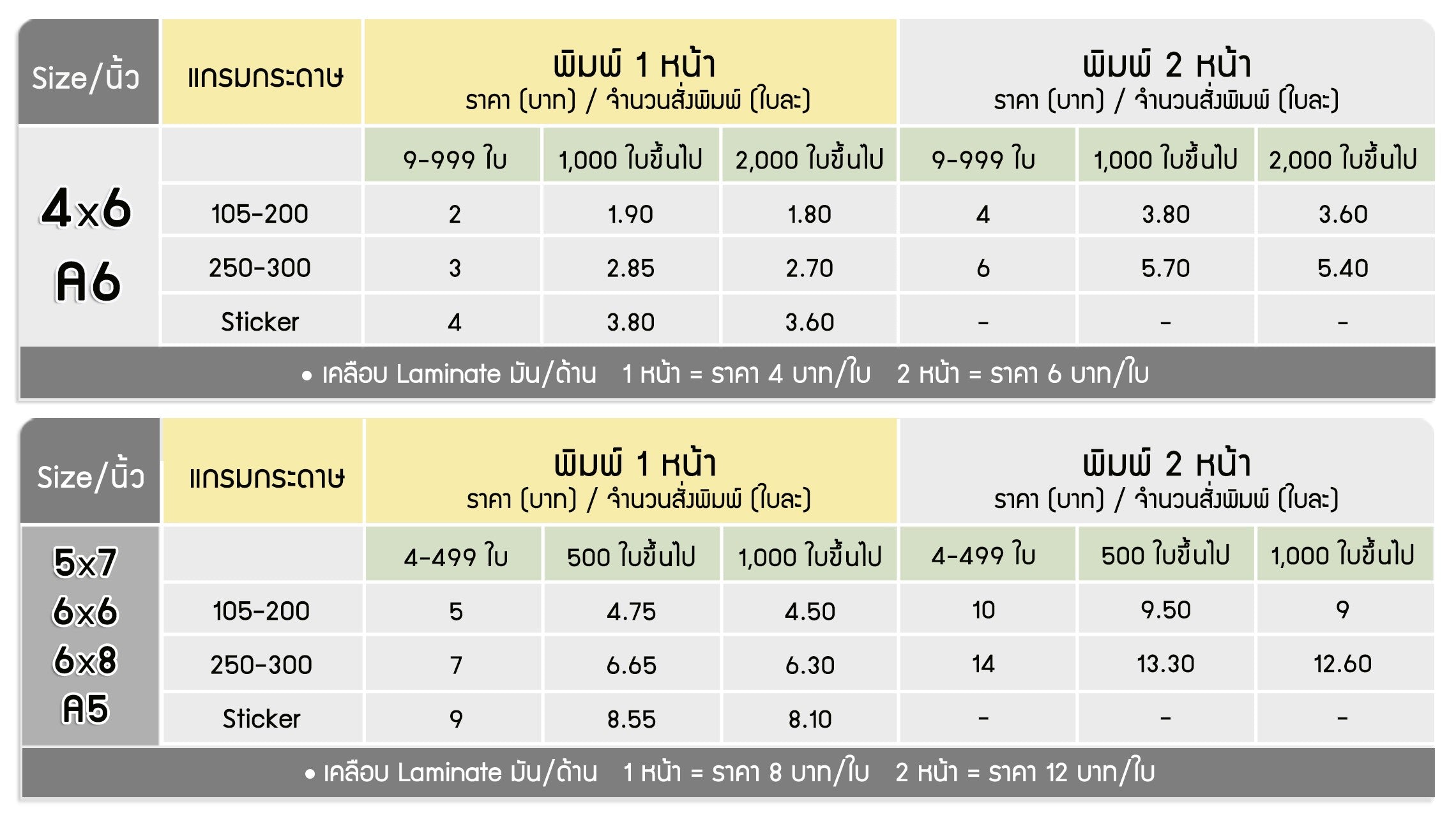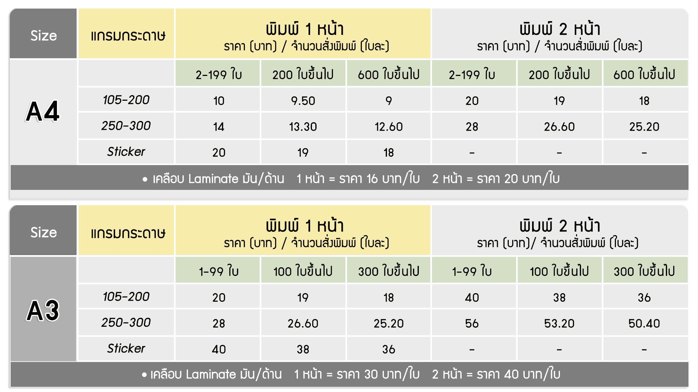 - คิดตามจำนวนกระดาษ A3 ที่ใช้ตามตาราง